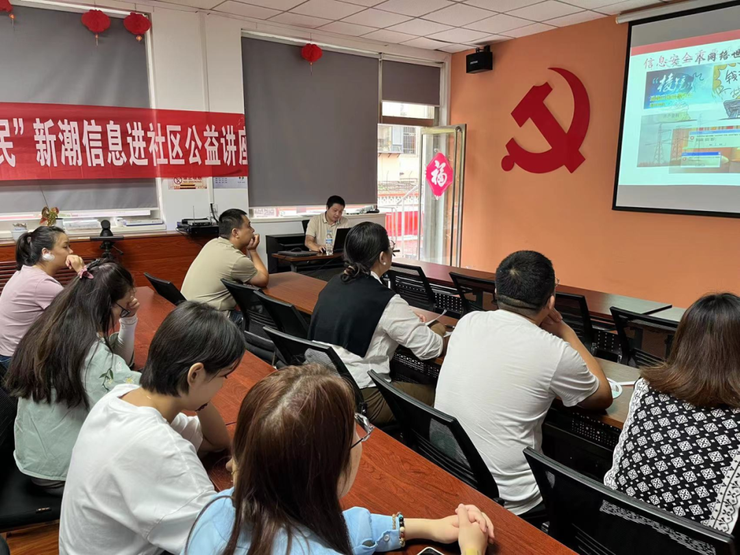 為增強社區(qū)居民的網(wǎng)絡(luò)安全意識和防范能力,預(yù)防網(wǎng)絡(luò)詐騙帶來的經(jīng)濟損失,營造安全、健康、文明的網(wǎng)絡(luò)環(huán)境。山東新潮信息黨支部在國家網(wǎng)絡(luò)安全宣傳周之際,走進社區(qū)開展以“網(wǎng)絡(luò)安全為人民,網(wǎng)絡(luò)安全靠人民”為主題的公益講座。