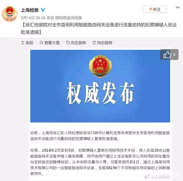 上海市徐匯檢察院對(duì)全市首例利用智能路由網(wǎng)關(guān)設(shè)備進(jìn)行流量劫持的犯罪嫌疑人依法批準(zhǔn)逮捕。經(jīng)查,2018年2月至3月間,犯罪嫌疑人章某利用網(wǎng)絡(luò)技術(shù)手段,侵入全國(guó)20余臺(tái)智能路由網(wǎng)關(guān)設(shè)備并植入蠕蟲(chóng)病毒,將終端用戶通過(guò)上述設(shè)備聯(lián)系公共網(wǎng)絡(luò)的網(wǎng)址重定向至其指定的賭博網(wǎng)站,從中牟取流量中介費(fèi)。僅章某被抓前1日,通過(guò)上海某網(wǎng)絡(luò)技術(shù)有限公司的一臺(tái)智能路由網(wǎng)關(guān)設(shè)備,全國(guó)38194個(gè)不同電腦系統(tǒng)設(shè)備的上網(wǎng)數(shù)據(jù)被修改。