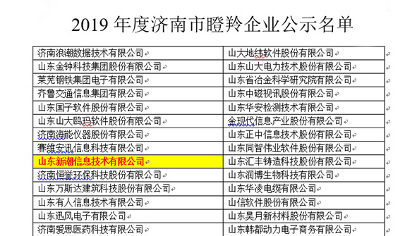 2019年8月,新潮信息被認(rèn)定為2019年度濟(jì)南市級(jí)瞪羚企業(yè)