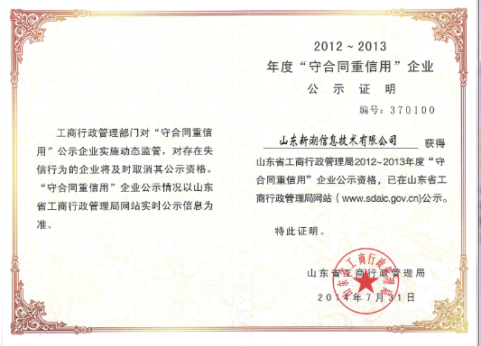 2014年7月,我公司獲得由山東省工商行政管理局頒發(fā)的守合同重信用企業(yè)證書。
